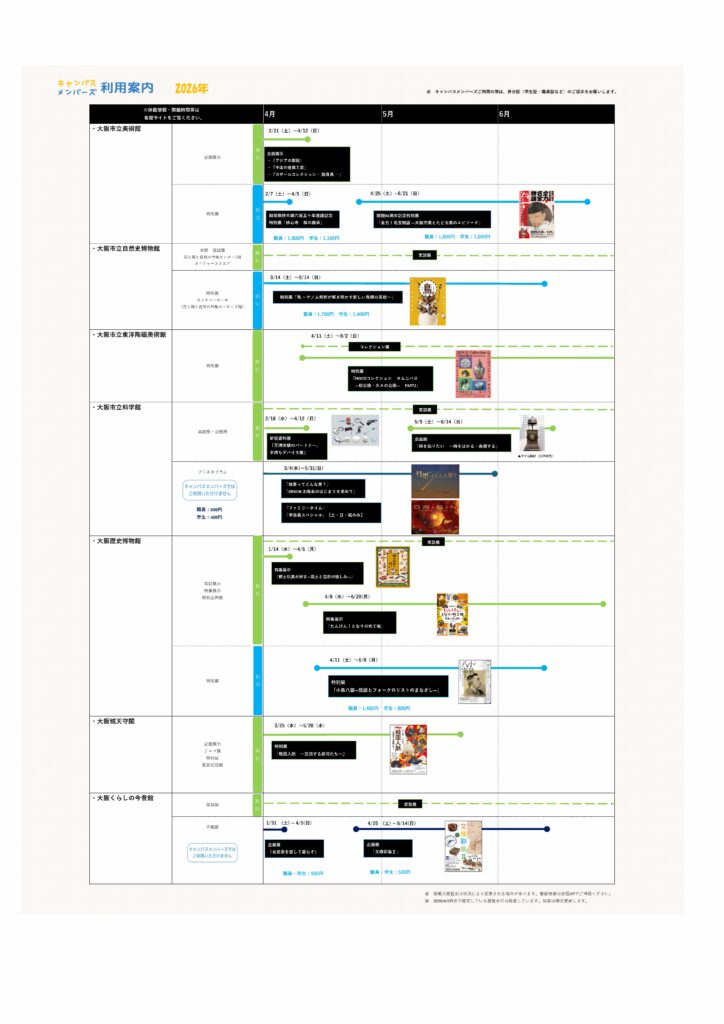 (地独)大阪市博物館機構と、大阪城天守閣を管理運営する大阪城パークマネジメント株式会社、大阪市立住まいのミュージアム 大阪くらしの今昔館を管理運営する大阪市住宅供給公社・アクティオ共同事業体は、7つの施設での大学生等による利用促進を図るため、「キャンパスメンバーズ」制度を設けています。