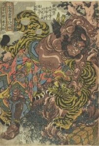 『水滸伝』の構成は年代ごとに増減があるものの17世紀に70回本が成立し、日本へは江戸時代に輸入され、日本においても爆発的な人気を得ました。曲亭馬琴が葛飾北斎の挿絵で『新編水滸画伝』を出版したほか、馬琴は『水滸伝』の日本版ともいえる『南総里見八犬伝』等を著すなど、翻案作品も多数書かれました。歌川国芳が大胆な構図と美麗な彩色によって豪傑たちを描いた浮世絵は今なお新鮮な魅力を放っています。