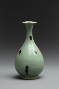 日本には、大阪市立東洋陶磁美術館の国宝《飛青磁花生》に加え、旧国宝にして現・重要文化財の《飛青磁花生》がもう一点伝わっている。長らく所在不明であったが、このたび大阪市立東洋陶磁美術館に寄贈され、本邦初となる国宝と重要文化財 の《飛青磁花生》が並ぶ歴史的な夢の共演が実現した。本作は双軒庵・松本松蔵(1870‐1936)旧蔵品である。国宝《飛青磁花生》と比較すると、高さは1.7センチメートル低く、頸部や胴部もわずかに引き締まった造形を示す。また鉄斑装飾は、国宝が計23箇所であるのに対して、重要文化財は計 11箇所と約半数にとどまり、斑点はやや大きい。底部のつくりもほとんど同一であり、両者は元代龍泉窯において同時期に制作されたものと考えられる。