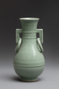 コの字形の両耳に大きな環(リング)が付くが、釉薬で胴部に固着して動かないため「不遊環」と呼ばれる花生。青銅器に倣った形と文様に、失透性の青緑の釉色が加わり、静謐(せいひつ)な趣を添える。底部のつくりは国宝や重要文化財の《飛青磁花生》と類似する。内田家、田村家旧蔵。