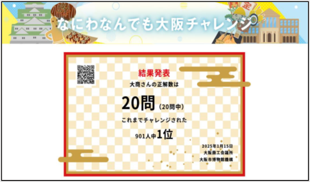 - 同クイズは専用サイトに、「なにわなんでも大阪検定」(2009~2022年度実施、主催:大商)の過去問題や機構の学芸員が作成した問題を掲載し、楽しみながら大阪について学んでもらうものです。2023年度に開始し、これまでに47都道府県から延べ54,370人が参加しました。